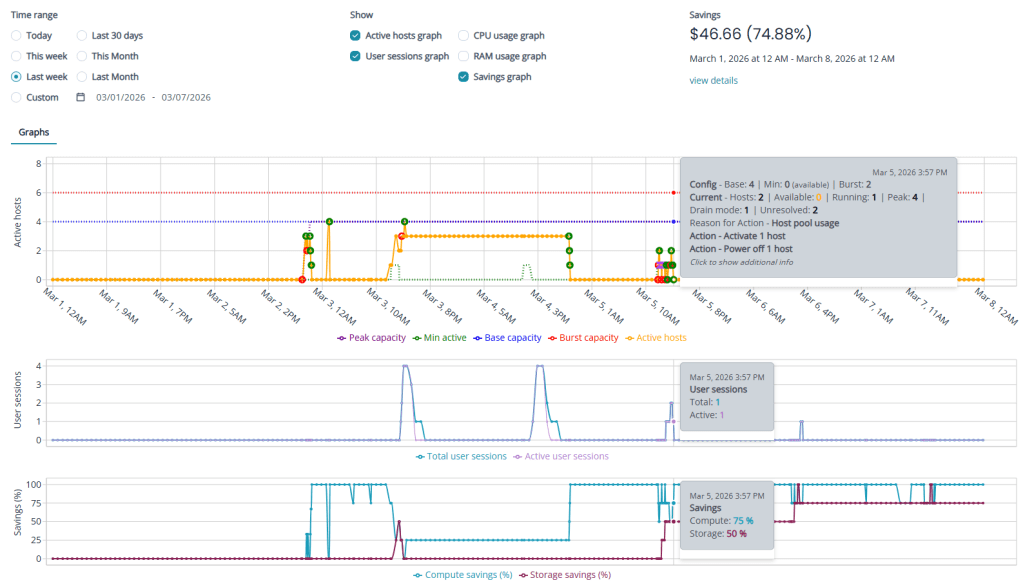 In many environments, utilisation data quickly reveals opportunities to right-size VM families or adjust session density.