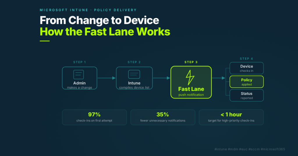 The last two are worth flagging for teams coming from SCCM: these can happen entirely behind the scenes. A group membership change driven by HR provisioning, or an automatic app update, still triggers a Fast Lane notification from Intune’s perspective. It’s worth understanding that the system is reacting to more events than an admin might consciously initiate.