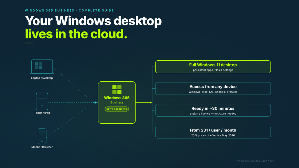 Windows 365 Business is Microsoft’s Cloud PC offering for smaller organisations — specifically, tenants with up to 300 users. It delivers a full Windows 11 desktop, hosted in Microsoft’s cloud, streamed to virtually any device a user already owns: Windows, macOS, iOS, Android, or a web browser.